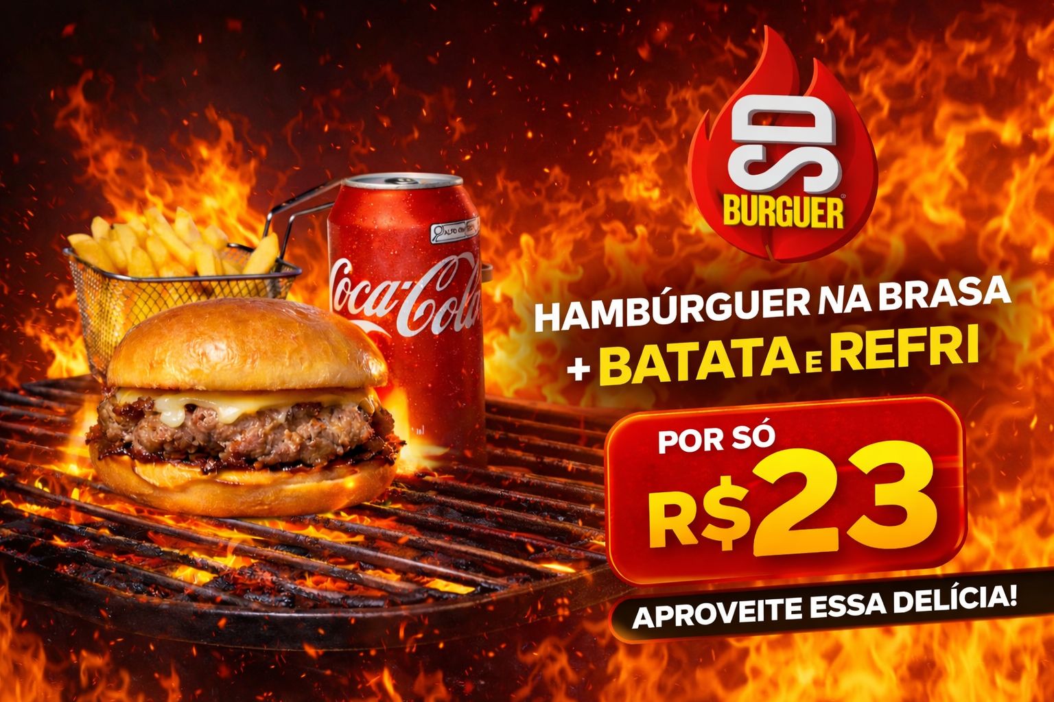 Combo Brasa Burguer, uma porção pequena caprichada de batata frita crocante feita na hora e um refrigerante lata (350ml) bem gelado (Coca, Pepsi, Guaraná ou Sukita laranja).